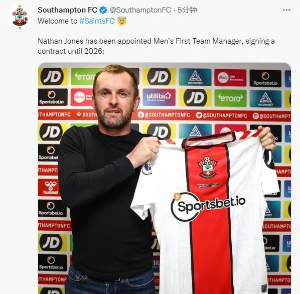 南安普顿官宣琼斯担任球队主帅 曾是英冠最佳教练
