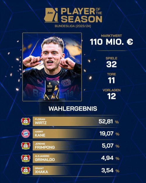 由球迷票选的德甲赛季最佳球员出炉,勒沃库森球员维尔茨当选。本赛季,维尔茨出战32场德甲比赛,打进11球并送出12个助攻,是勒沃库森问鼎德甲的功臣之一。