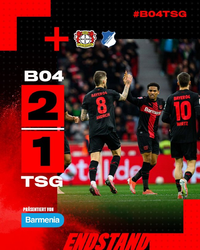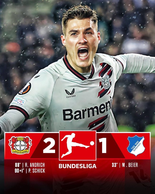 德甲第27轮,勒沃库森在先丢一球且长时间落后的情况下,2-1逆转绝杀霍芬海姆。截至目前,勒沃库森以73分强势领跑德甲积分榜,在先赛一场的情况下,已经领先拜仁13分之多。