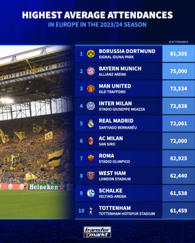 根据数据网站转会市场的统计,2023-24赛季上座人数最高的10座球场出炉。排名第1的是多特蒙德主场伊杜纳信号公园球场,其平均上座人数高达81305,拜仁排名第2,平均每场的现场观赛人数是75000。