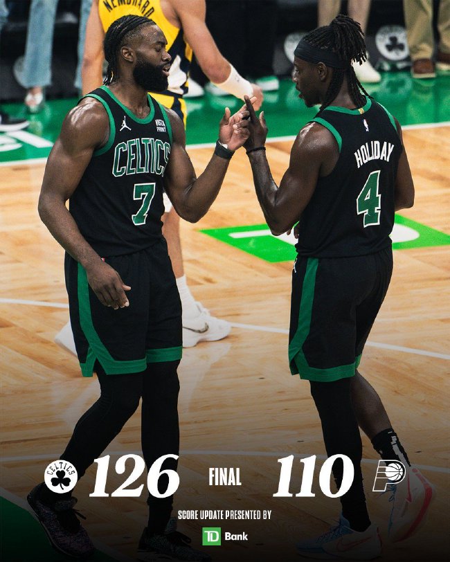 北京时间5月24日,NBA季后赛东部决赛G2,凯尔特人126-110大胜步行者,凯尔特人大比分2-0领先。凯尔特人(2-0):布朗40分5篮板、塔图姆23分6篮板5助攻、怀特23分4篮板6助攻、霍勒迪15分3篮板10助攻、普理查德12分、霍福德6分10篮板