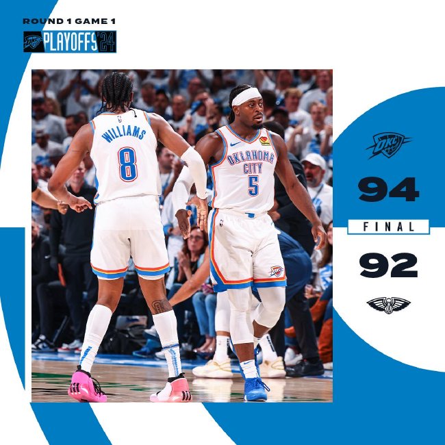 北京时间4月22日,NBA季后赛首轮,雷霆94-92险胜鹈鹕,大比分1-0领先。雷霆(1-0):亚历山大28分6篮板4助攻、杰伦-威廉姆斯19分7篮板4助攻、霍姆格伦15分11篮板2助攻5盖帽