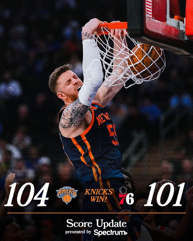 北京时间4月21日,NBA季后赛,尼克斯111-104险胜76人,大比分1-0领先。尼克斯(1-0):哈特22分13篮板、布伦森22分7篮板7助攻、麦克布莱德21分3篮板4助攻、阿努诺比11分4篮板、博格达诺维奇13分7篮板、罗宾逊8分12篮板4盖帽