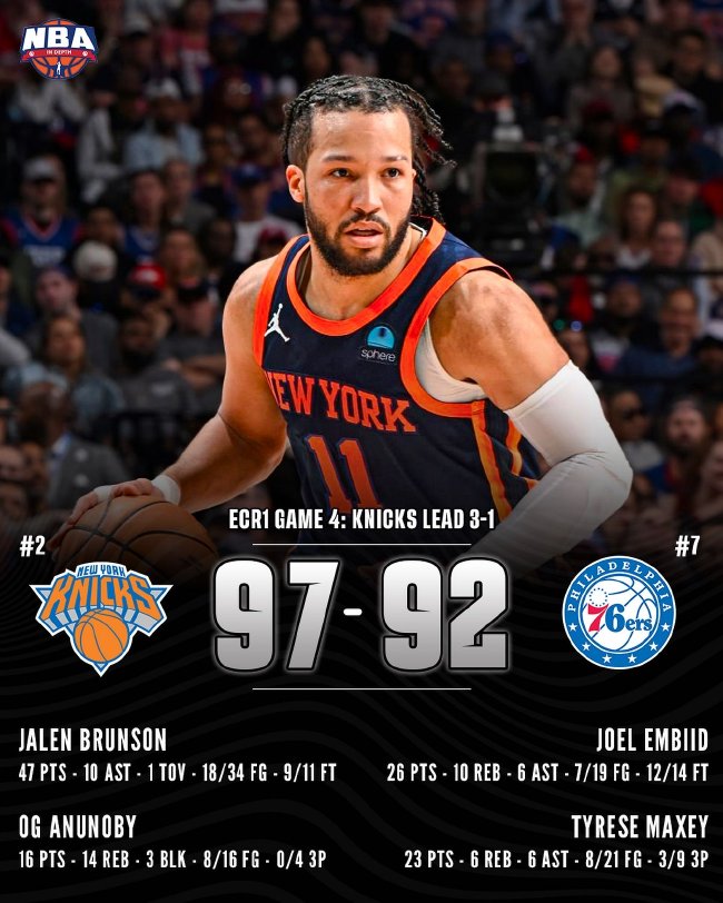 北京时间4月29日,NBA季后赛首轮,尼克斯97-92力克76人,尼克斯大比分3-1领先。尼克斯(3-1):布伦森47分4篮板10助攻、阿努诺比16分14篮板3盖帽、麦克布莱德13分4篮板、哈尔滕施泰因8分4篮板、哈特4分17篮板5助攻3盖帽
