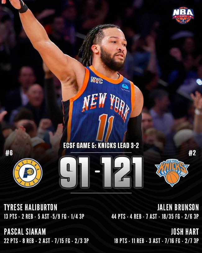 北京时间5月15日,NBA季后赛东部半决赛G5,尼克斯121-91大胜步行者,尼克斯大比分3-2领先。尼克斯(3-2):布伦森44分4篮板7助攻、哈特18分11篮板、伯克斯18分5篮板、麦克布莱德17分4助攻、哈腾7分17篮板5助攻、迪文琴佐8分7篮板4助攻